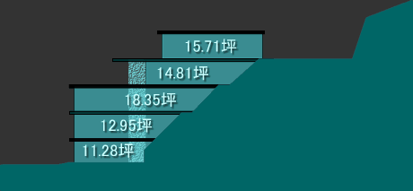右の図をご覧下さい→ この敷地は全体で約320坪あり、南下がりの斜面地で北側の端が山の頂上になります。通常ですと、階段とよう壁を作りながら、ひな壇状の分譲地になるところですが、あえて短冊状に分割した4つの敷地を想定しました。こうすることにより、全戸が道路に直面し、かつ、山の頂上までを占有できます。1区画の間口は6〜7mですが、全ての住戸がゆったりとした外部スペースを専有(専有庭)あるいは共有(裏山)することになります。 |